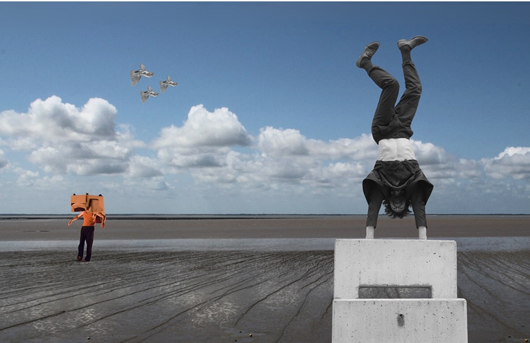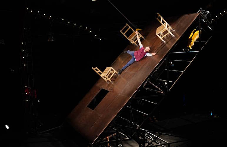 Repoussant toujours plus loin les limites, six acrobates se jouent de la gravité sur une structure inédite : un grand plan incliné dont l’angle varie de l’horizontalité à la verticalité !