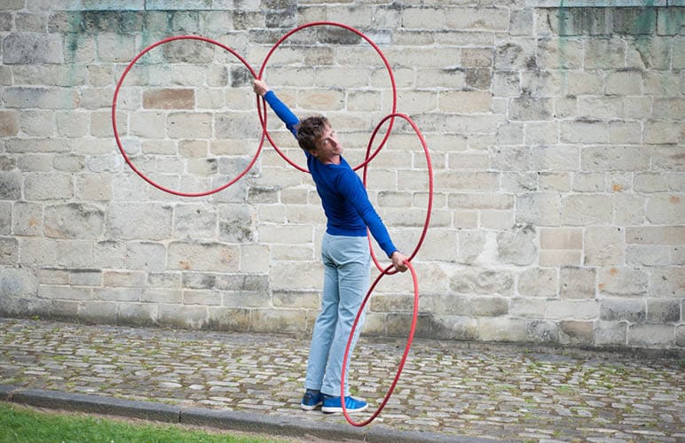 La relation riche et complexe de Monsieur O et de ses cerceaux rouges. Entre danse, manipulation et théâtre, un petit monde drôle et absurde qui tourne en rond !