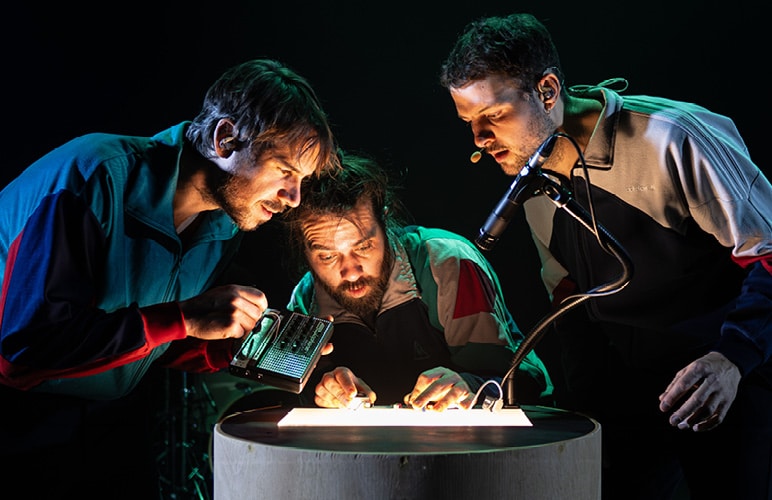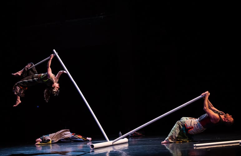 Équilibres et agencements improbables au millimètre près… De longs bâtons blancs servent d’agrès aux trois acrobates, dessinant une scénographie géométrique mouvante au rythme de la musique live.