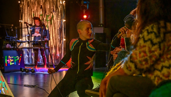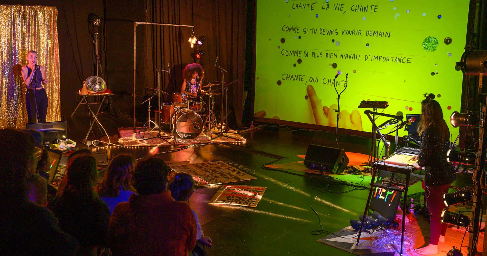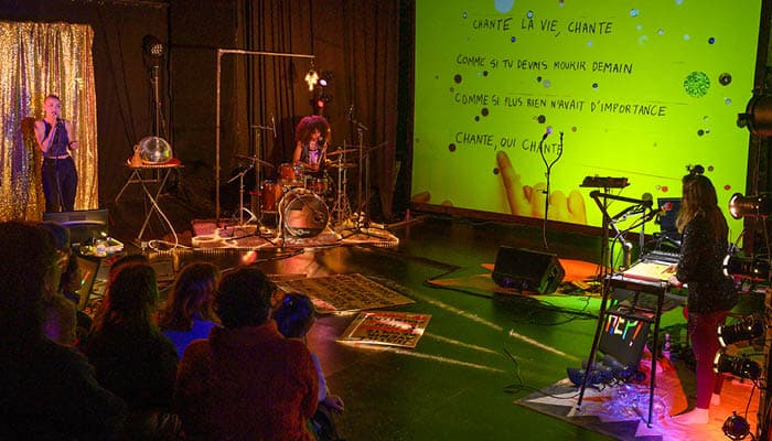 Ce karaoké pas comme les autres réunit sur scène une comédienne « kara-jockey », une batteuse énergique et une dessinatrice déjantée. Elles vous accueillent et vous invitent à chanter (ou juste écouter) tout en explorant la nature du karaoké avec humour et créativité, artisanat et fantaisie. Au fil de la soirée, les choix visuels comme ceux de la playlist dévoilent une réflexion sur le karaoké et toutes les problématiques qu’il soulève. Qu’est-ce qu’un tube ? Le hurler dans un micro est-il une expérience individuelle ou collective, une manipulation capitaliste bien orchestrée ou une thérapie de groupe par la musique ? Mêlant le populaire et le politique, le Collectif F71 fait de ces débats un moment joyeux et généreux. Un concert-spectacle à partager en famille ou entre amis !