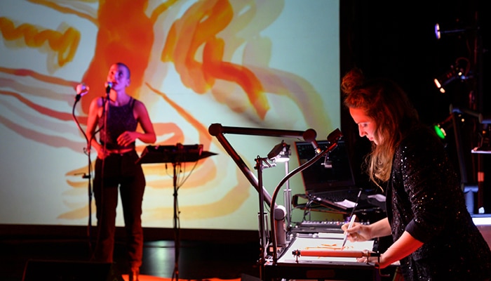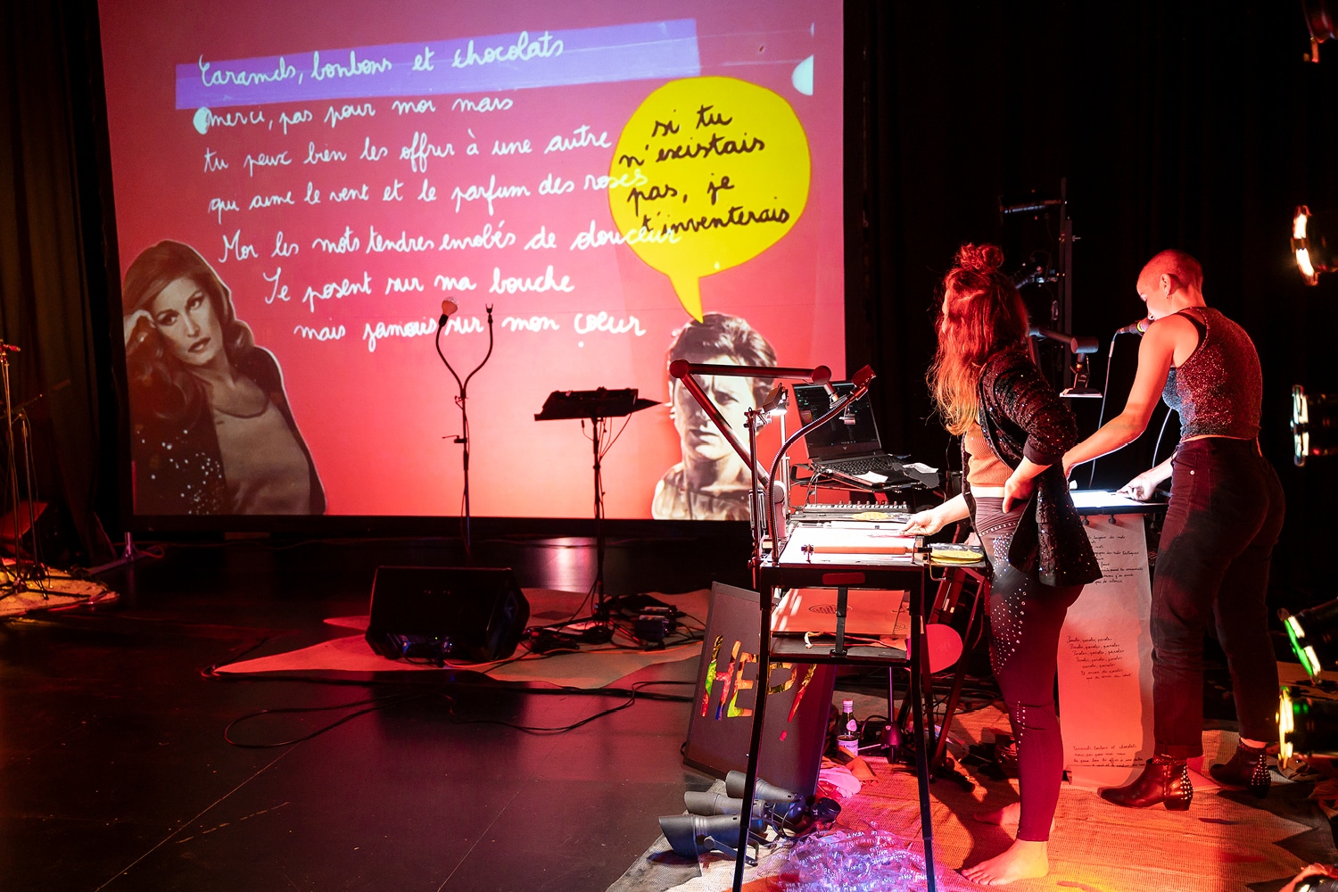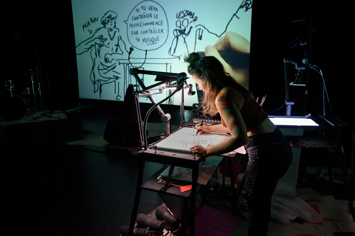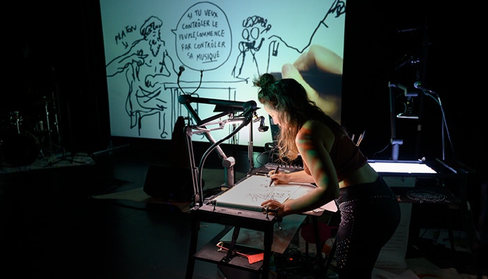 Projet : collectif F71 / Texte & mise en scène, Lucie Nicolas / Avec : Clara Chotil (manipulation et dessin en direct), Alix Ewandé (batterie et percussions), Camille Plocki (interprétation et chant) / Lumières : Laurence Magnée / Son : Clément Roussillat / Vidéo : Morgane Viroli / Remerciements : Max Potiron; Léa Gadbois-Lamer et Laurent Andrieu