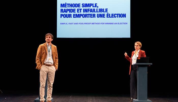 Gare aux dangers de la propagande 3.0 ! Avec cette satire en forme de fausse formation, la compagnie Cassandre nous fournit les outils pour déconstruire les techniques de manipulation. L’art d’avoir toujours raison livre une « Méthode simple, rapide et infaillible pour emporter une élection ». Sur scène, deux scientifiques issus du GIRAFE – Groupe International de Recherche sur l’Accession aux Fonctions Électorales – prétendent avoir trouvé un procédé qui, suivi à la lettre, permet de gagner n’importe quel affrontement électoral. Ils exposent leurs techniques devant un parterre de candidats aux futures élections : vous, cher public ! Une comédie documentée et engagée à l’humour féroce, qui nous incite non pas à rejeter en bloc les politiciens, mais à rester des citoyens en éveil, vigilants et critiques.